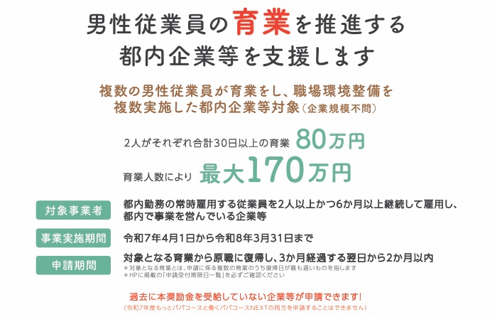 都内勤務の常時雇用する従業員を2名以上かつ6か月以上継続して雇用し、都内で事業を営んでいる企業等 ※企業規模はコースごとに異なります。 【事業実施期間】 令和7年4月1日から令和8年3月31日まで ※予算の範囲を超えた場合は、申請受付期間内でも受付を終了します。 【申請期間】 対象となる育業から原職に復帰し、3か月経過した翌日から2か月以内